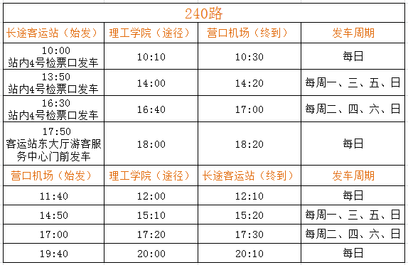 經(jīng)公司營(yíng)運(yùn)部門與機(jī)場(chǎng)工作人員溝通:從2018年3月25日起,營(yíng)口藍(lán)旗機(jī)場(chǎng)執(zhí)行新的航班時(shí)刻表(部分航線停發(fā))。針對(duì)上述情況,為方便市民出行,經(jīng)公司研究,現(xiàn)對(duì)機(jī)場(chǎng)240路運(yùn)營(yíng)班次進(jìn)行調(diào)整。具體內(nèi)容如下:
